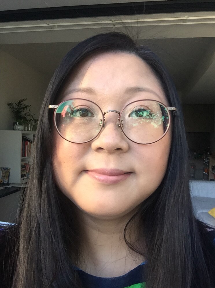 The MUA (makeup artist — I'd been watching Glow Upward on Netflix), who I'll call Sandy, wore glittery gilt eye shadow, a light pink smiling, and a face up shield similar a welder.